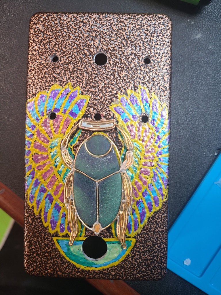 That beetle. The full article will have all the info that went into building that beetle. I think it took me about a month to get it to where I was satisfied. As with the other egyptian themed pedal, I used phoenician letters for the labels and Egyptian art. I have a few more on the way. All on Tayda copper hammer enclosures.