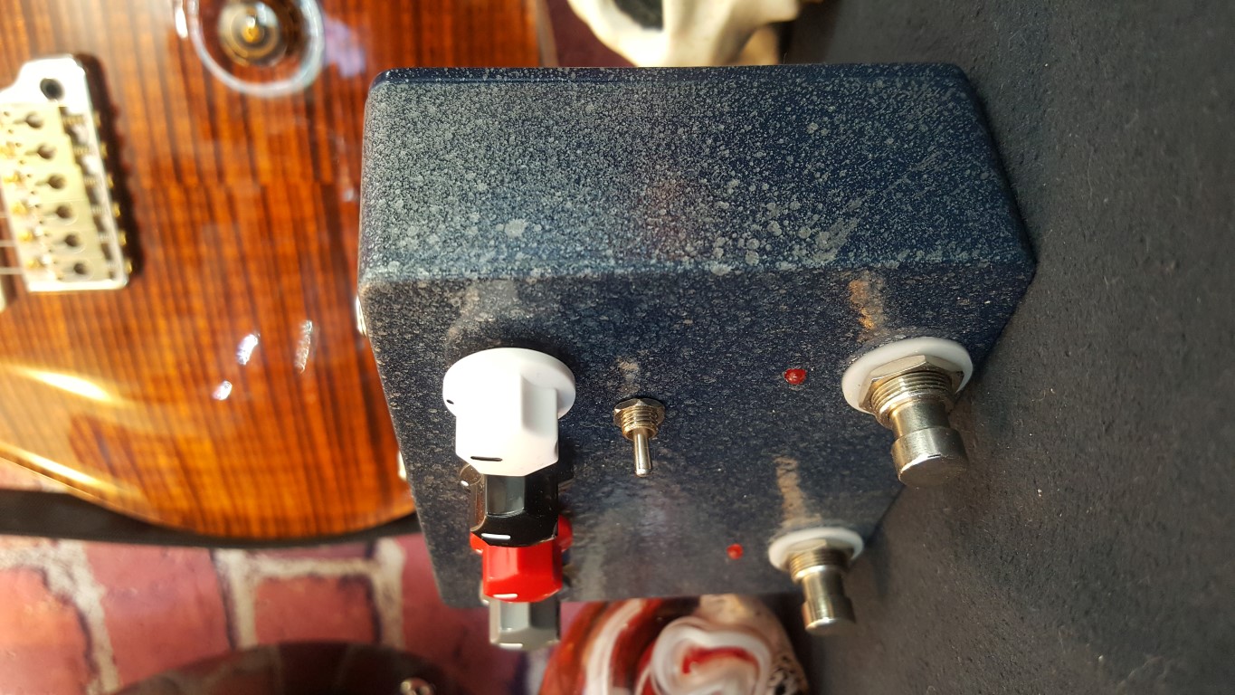 This is not finished. I want to make little copper or aluminum plaques for the controls. Then epoxy coat the entire thing. This is also the first and only pedal I have painted so far. I used a pewter hammer texture paint and a nice blue. I put alternating layers to get this effect. I plan to epoxy coat the plaques onto the top when it is finished.
